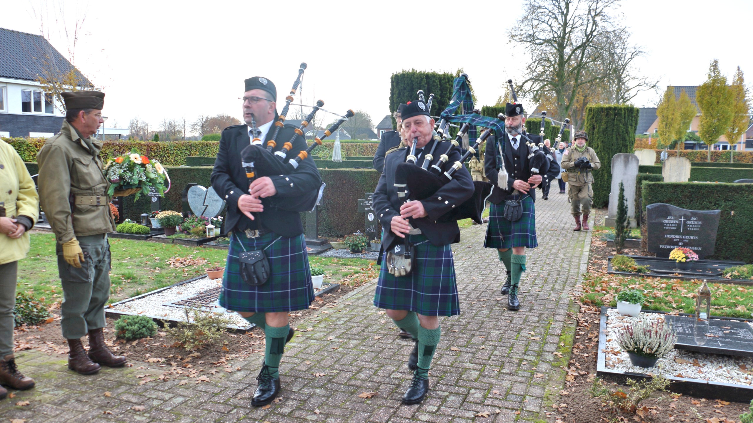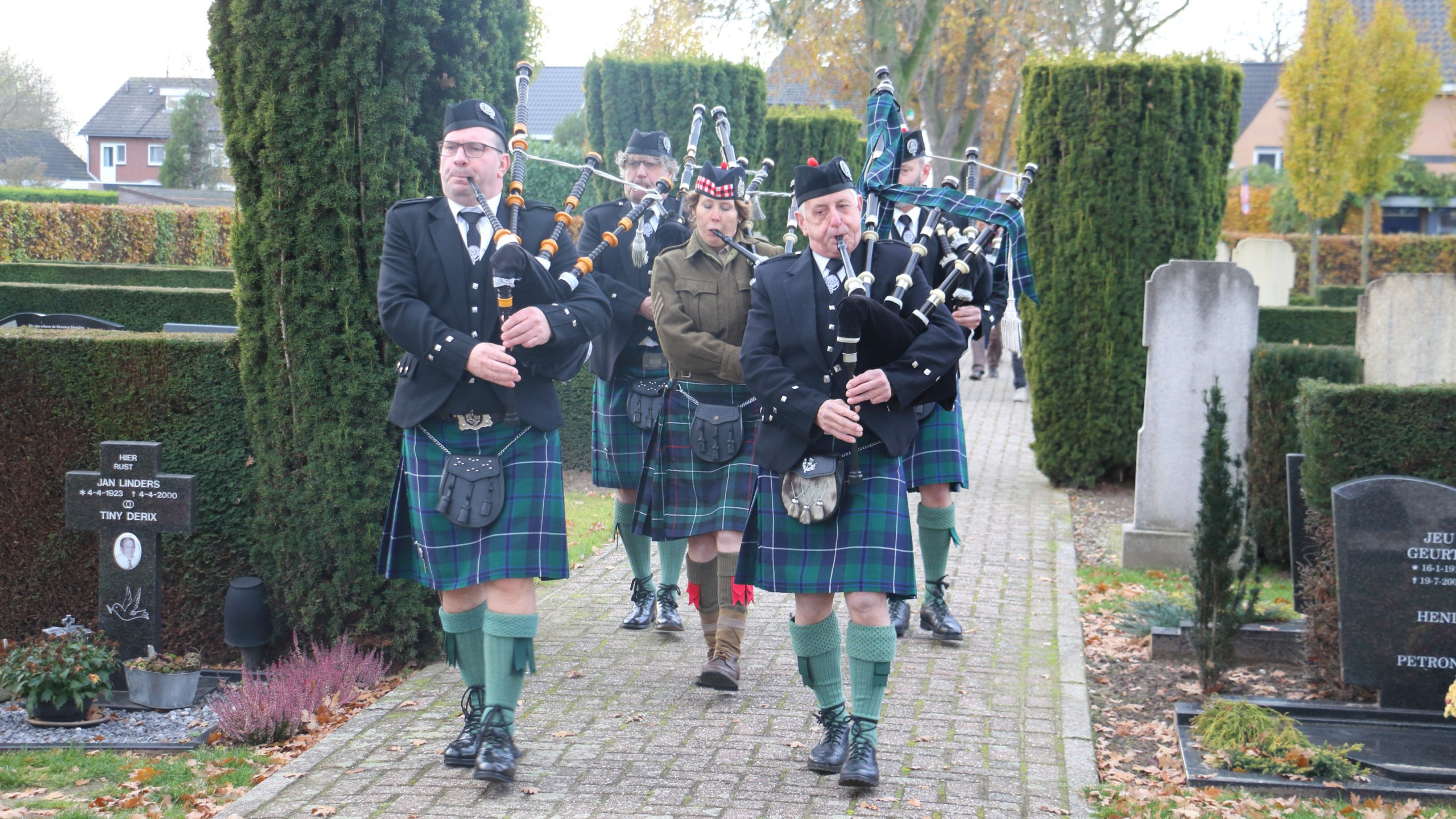 Onder indrukwekkende tonen van doedelzakmuziek werd er een bloemstuk gelegd bij de plaquette van de Hegelsomse oorlogsslachtoffers. Onder klokgelui vertrok de stoet via de Heijnenstraat, langs de kerk om via de Pastoor Debijestraat hun bevrijdingstocht te vervolgen.