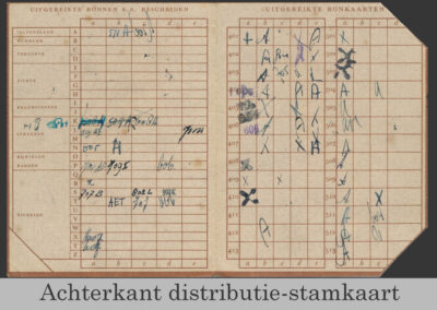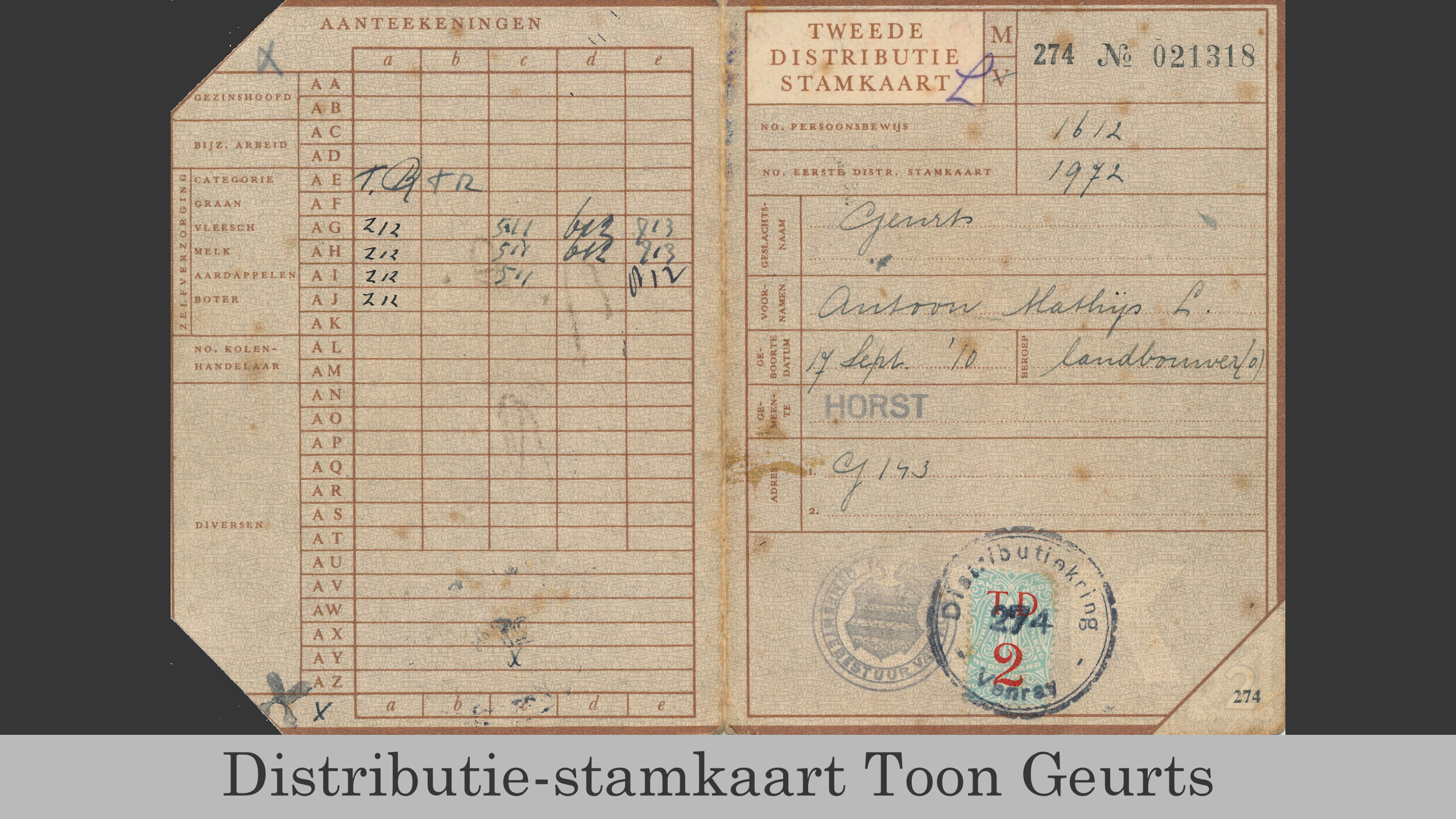 In oktober 1939 werd met de distributie begonnen. Het verbruik kon voortaan d.m.v. bonkaarten worden geregeld. In april 1942 kwamen tabakswaren op de bon. Alhoewel het geen eerste levensbehoefte was, konden veel mensen het “rokertje” toch maar node missen. En zo kwam het dat er op de zwarte markt goud te verdienen viel. Ook rijwielbanden werden schaars. Op de boerderijen begon men bijna alles clandestien te produceren. Het maken van boter en kaas, het malen van graan, zelfs uit vetten werd zeep gemaakt voor de was. Rogge werd gebrand tot surrogaat-koffie. Doordat alles schaars werd, kwamen mensen uit de stad naar het platteland om een en ander te bemachtigen. Op een dag werd vanuit het voedselbureau het station in Helmond gebeld. Men vroeg hoeveel retourtjes er voor Horst-Sevenum waren afgegeven. Het bleken er 220 te zijn, voor die tijd abnormaal veel.