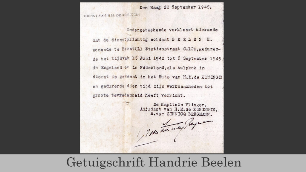 In een getuigschrift van Kapitein Vlieger, adjudant van H.M. de Koningin lezen we het volgende: “Ondergetekende verklaart hiermede dat de dienstplichtige soldaat BEELEN H. wonende te Horst, Stationstraat G.126, gedurende het tijdvak van 15 juni 1942 tot 8 september 1945 in Engeland en in Nederland, als hulpkok in dienst is geweest in het huis van H.M. de koningin en gedurende dien tijd zijn werkzaamheden tot grote tevredenheid heeft verricht”.