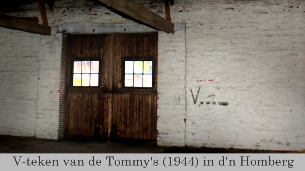 In de morgen komen lange colonnes tanks en gevechtswagens van Sevenum afzetten om het door de Duitsers verlaten Horst vreedzaam te veroveren. De Tommies, zoals de Engelsen werden genoemd, namen onder andere bij boerderij” “d’n Homberg” de plaats over van de Duitsers, die de dag ervoor waren vertrokken. In de schuur daar, hebben ze met verf een “V” van “Victory”, zowel in tekst als in morsecode (3 puntjes en 1 horizontaal streepje), op de muur gezet.