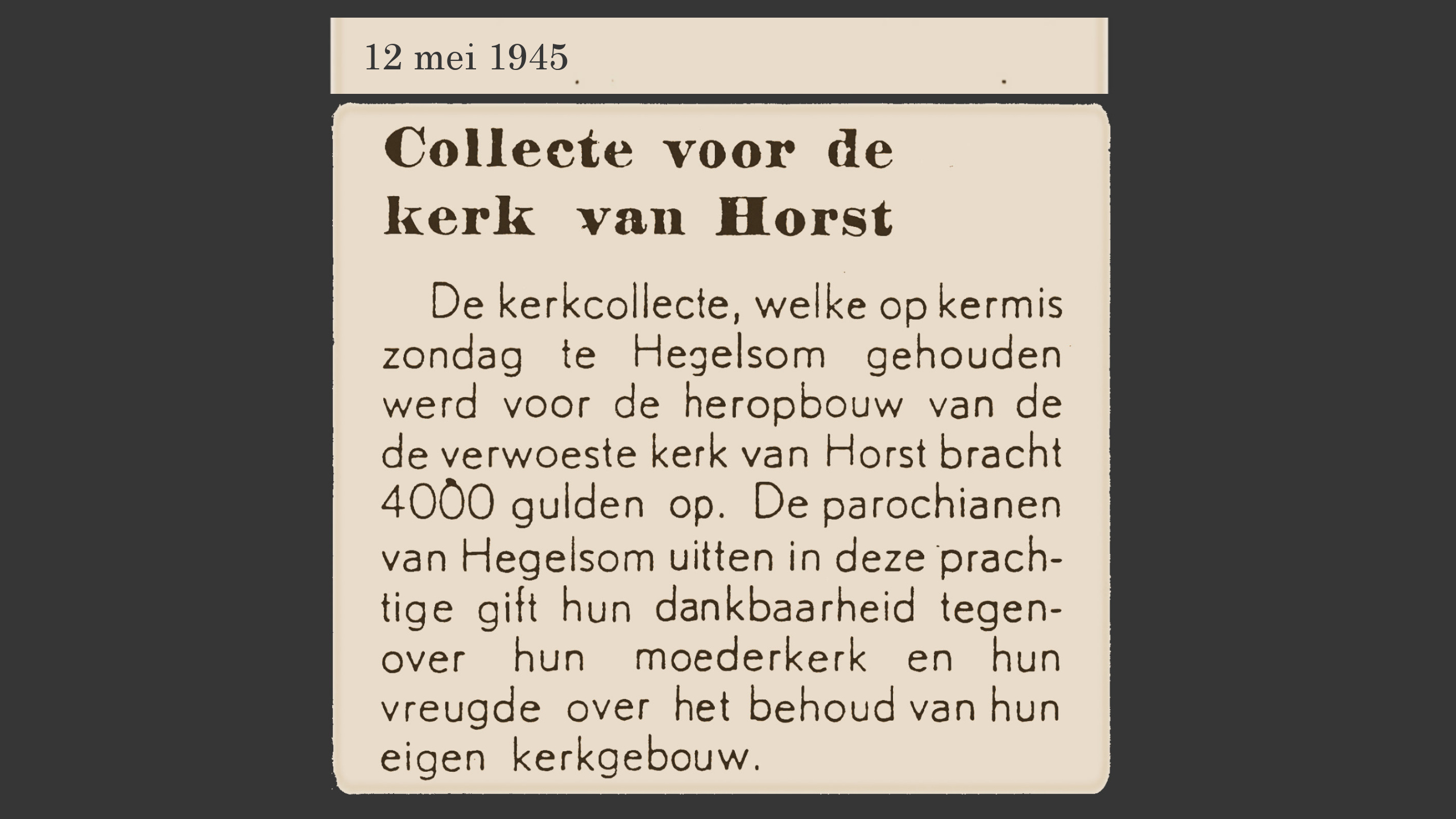 We gebruiken in dit bevrijdingsconcert de informatie en beeld- en geluidsmateriaal van de Stichting Heemkunde Hegelsom, om terug te blikken op wat er zo al gebeurde en wat de gevolgen waren voor onze parochie en dorpsgemeenschap.