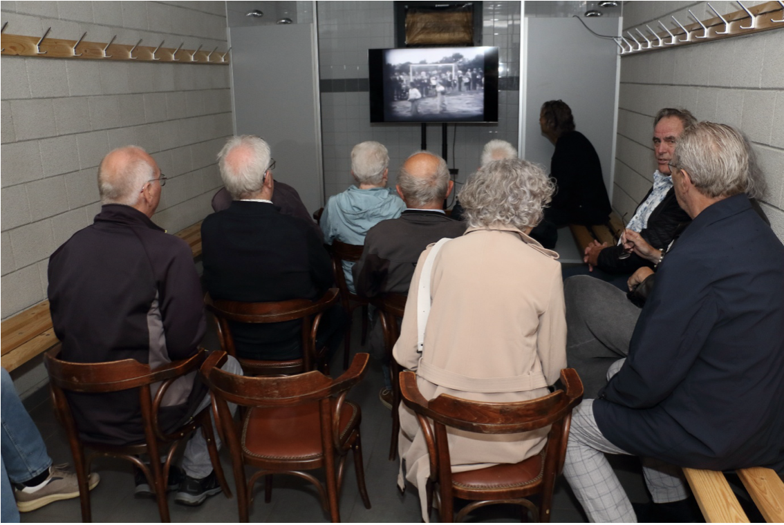 Hier wordt doorlopend een film vertoond met o.a. beelden van het parochiefeest in 1963, viering kampioenschap seizoen 1966/’67, opening sportpark Wienus in 1969, een reisje van de veteranen. Maar ook recentelijke beelden, te denken aan het eerbetoon voor Twannie in 2022.